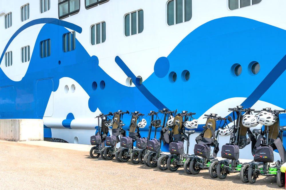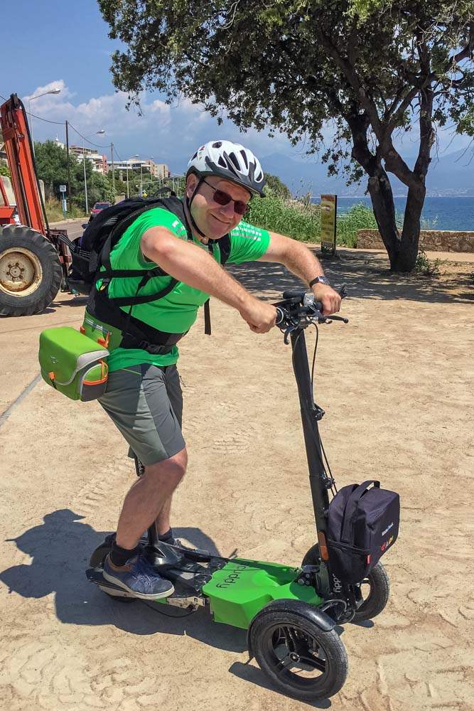 Scuddy's sind tolle Geräte. Es sind dreirädrige batteriebetriebene Roller, welcher einfach zu fahren sind. Nach ein paar Runden auf einem Parkplatz ging's auch gleich los.